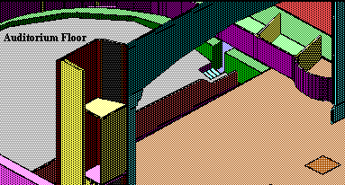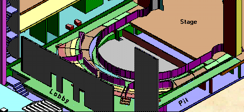 In this view on the left, looking west, we see the green of the lobby and lobby hallways, and the low purple walls that delineate the front of the main floor boxes. Note the steps leading from the lobby to the boxes, and the swell of the proscenium boxes on either side of the stage. The dark green wall belongs to the pit lobby and pit passage, below the level of the auditorium floor. In the view at right, drawn as though in the stage left flies looking toward down right, we see the stage right (house left) proscenium box, and the steps leading down to the pit passage from the floor of the auditorium (shown here in gray.) The flooring of the boxes has been cut away to reveal the dark green of the pit passage walls and the dark brown orchestra pit masking has been cut away on stage right to show the steps which descend from the auditorium to the pit passage in the basement. |
