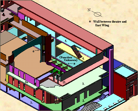 Figure 2 shows the same view as seen in Figure 1, with the purple wall separating the main theatre from the east wing removed, revealing the entire stairway from the "Ladies Coffee Room" (4) to the 3rd Level Boxes.