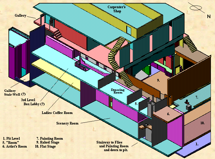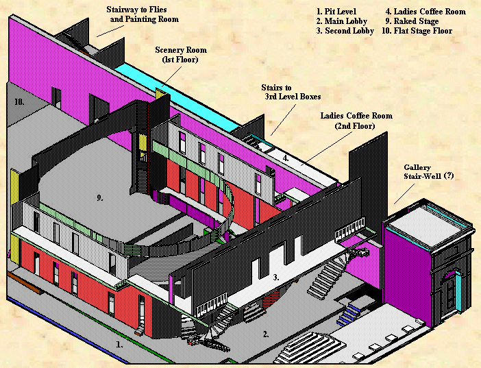Above the "Ladies Coffee Room," reached by a steep flight of steps, were the third level boxes. These were at a level below the gallery. The gallery was accessible only via the enclosedstairways at the front (north) of the wings. In Figure 5 the 3rd Level Box passageway, and a room which probably served as the 3rd Level Box Lobby, are color-coded blue. The Gallery Lobby above, and thepassageway which leads back-stage to the Passage over the Proscenium and to what Henry Warren called the "Picture Room," have been colored light red. Figure 6 has been included for reference.