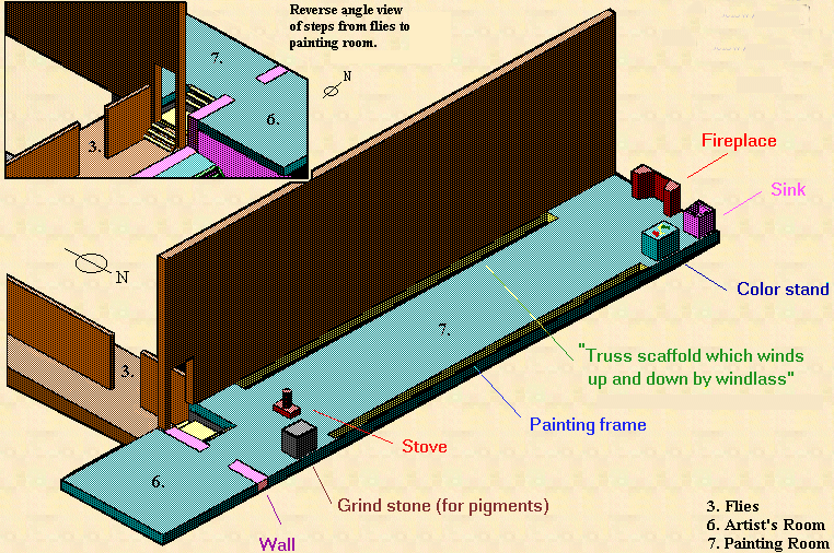 on the south wall of the painting room there is what Warren calls a "truss scaffold, which winds up and down by windlass." There is no further mention of this device among the records