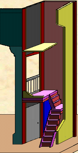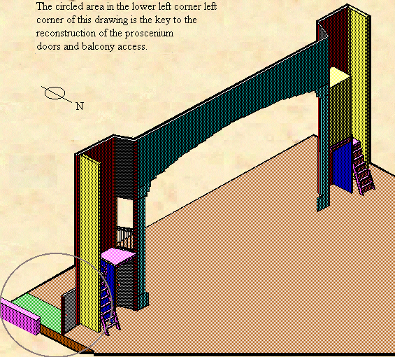 The Nisbet/Darley plan indicates that the passage to the first lobby boxes, shown in green in the drawing on the left, terminates in a door which provides access to the backstage. To the east of the lobby passage (on the left as you look at the drawing, in purple) is a wall which separates the lobby passage from what was probably a storage area in the east wing of the building. This wall continued to the north (up-stage) wall of the theatre, and it is clear from the Nisbet/Darley plan that there was no off-stage wing space in the Chestnut Street Theatre. The problem in reconstruction, then, was how to fit the proscenium door and some sort of stairway to the balcony above, into a very limited space. After much experimentation, the solution provided in this drawing and the detail below was arrived at. Stairs, rather than a ladder, seem appropriate, as it would have been extremely difficult for a woman, dressed in 19th century clothing, to negotiate a steep ladder. These stairs would have been bad enough! In the view of the stage right proscenium (picture on the right,) looking from upstage right toward the auditorium, we see the masking for the balcony (cut-away, in yellow), and themasking wall (dark blue ) which hid the stairway when the proscenium door was opened. | ![]() |