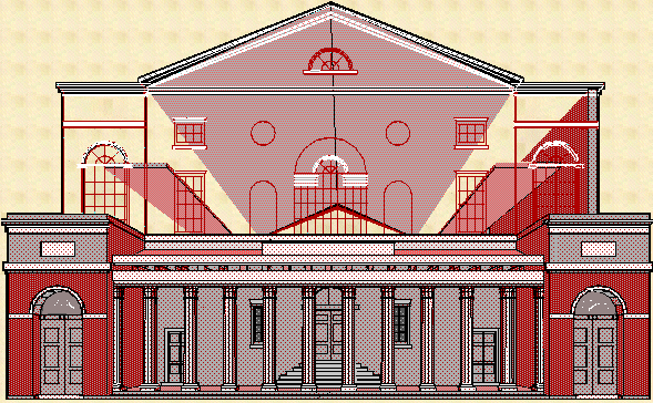 " . . . presents a handsome front on Chestnut Street, of ninety feet, including two wings, of fifteen feet each. The center building is ornamented with two spirited and well executed figures, of tragedy and comedy (by Rush), on each side of a great Venetian window, over which, in two circular tablets, are emblematical insignia. The top of this center building is crowned by a pediment. The wings, opened by large windows, recede a little from front, above, but project below, twelve feet, to the line of the street, faced with marble; these pavilions are decorated with emblematic figures, in tablets, and connected together by a colonnade of ten fancy Corinthian columns." To the left, separated from the theatre by a narrow alley, is the Bolivar House, with shops on the lower floor and living quarters above. To the right stands the Shakespeare Building, with shops on the ground floor, accommodations for theatre patrons on the floor above. Little is know of this building. |