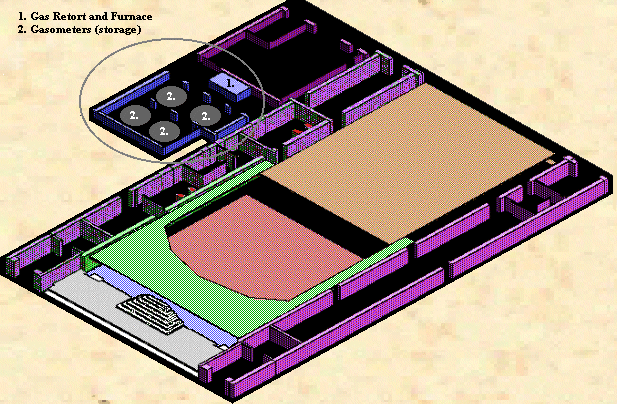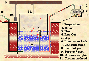 Parts 1, 2 and 3 are where the gas was actually produced. The fire-box (3) heated a sealed chamber (2) filled with blocks of pitch. Turpentine (1) dripped into the chamber to dissolve the pitch. The advantage of pitch over soft coal, commonly used in England and later in North America, was that pitch contained little hydrogen sulphide and was therefore largely odor free. From the retort (2) the raw gas passed through a pipe (4) to the gasometer, the storage and pressurizing chamber. This pipe entered the gasometer, which was filled with a chemical bath (6) to remove tars and odor-causing chemicals, below the water line, and was topped with a cap (5), similar to an inverted drinking glass, from under which the gas could escape but which kept water out of the pipe. Once free of the water bath, the gas was collected under a counter-weighted hood (11). The counter-weights could be adjusted to allow the gasometer to fill with gas (i.e., by allowing the hood to "float" upward), then readjusted to force the gas -- under pressure -- out the supply pipe (8) to the theatre building. | ![]() |