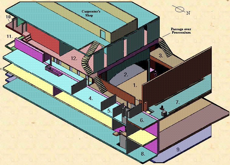 Located high above the stage floor, the painting room has a slot along the north wall, the "painting frame," that allows a drop or backshutter to be raised from below. In addition,
