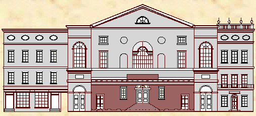 | William Birch's 1801 drawing of the theatre, looking west on Chestnut Street, reveals the building with its facade unfinished. A rough wooden lean-to anticipates the construction of the colonnade and roof over the entrance. Birch's drawing of the theatre in 1804 shows the facade in its finished form. The west "vestibule" or wing is in the foreground, and the colonnade and marque are represented clearly.*
