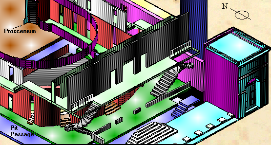 Once past the control wall, those bound for boxes on the main floor entered the rear of the theatre via short flights of steps immediately before them as the entered the lobby, or passed down one of the passages to the right or left to seats nearer the front of the house. Patrons bound for the upper level of seating turned left or right to ascended a curving stairway to the second floor lobby. |