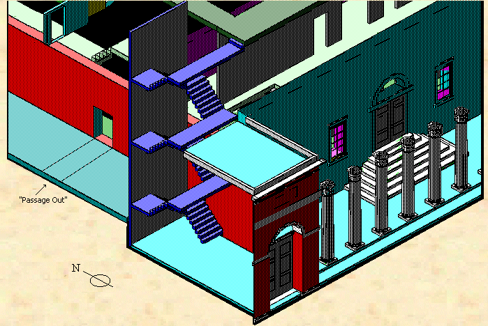 | Two views from the computer model reveal the relationship between the stairs in the west "projecting wing" and the remainder to the west portion of the building.