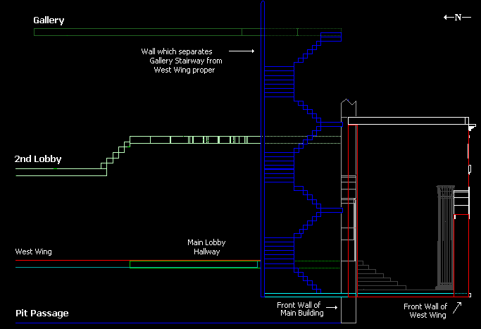 The second view is a section through the west wing, showing the relationship between the gallery stairs and the Main, Second and Gallery lobbies. | ![]() |