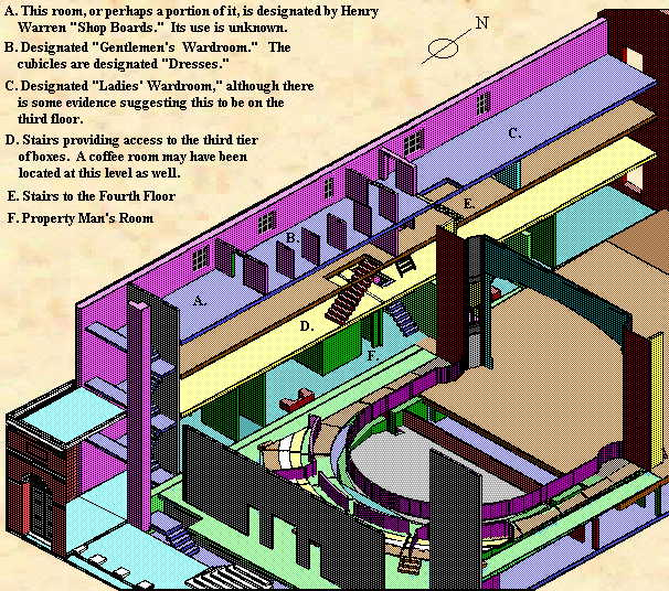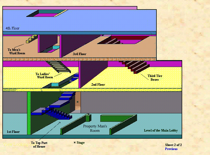 This schematic of the stairways in the West Wing (at right) shows the arrangement developed from the Nisbet/Darley and Henry Warren plans of the theatre. The view is from the west, looking east. The asterisk just above the bottom of the (blue) stairway to the top of the house marks the location of the stage, seen through the doorway just upstage of the proscenium.*