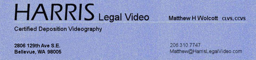 | Matthew H. Wolcott, for many years an Associate at VideOccasions, established Harris Legal Video in 2011. Certified by both the National Court Reporters Association as a Certified Legal Video Specialist (CLVS) and by the American Guild of Court Videographers as a Certified Court Video Specialist (CCVS,) he may be contacted at 206-310-7747 or by email for availability and scheduling. |
